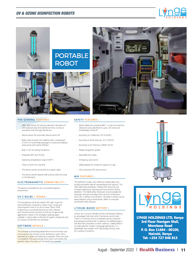 A Kenyan biomedical distributor-Lynge Holdings—has sourced for a robotic environmental disinfection machine capable of providing extra line of defense in hospitals and public spaces, besides existing public health guidelines such as personal protective equipment (PPEs), social distancing and handwashing.